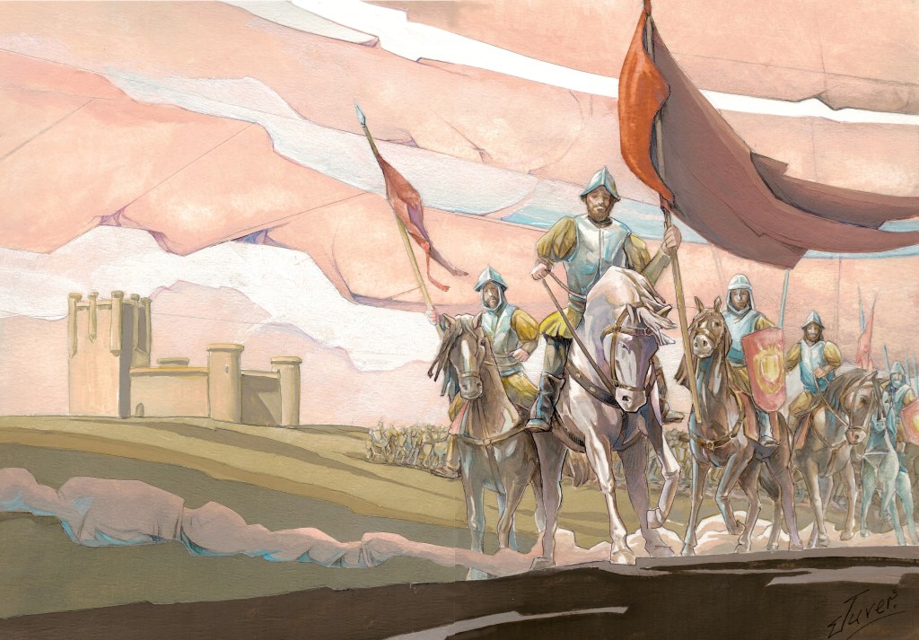 —¡Desplegad los pendones! ¡Qué redoblen los tambores! —gritó desde su caballo— ¡Qué no nos crean cobardes que huyen! ¡Preparaos para luchar!